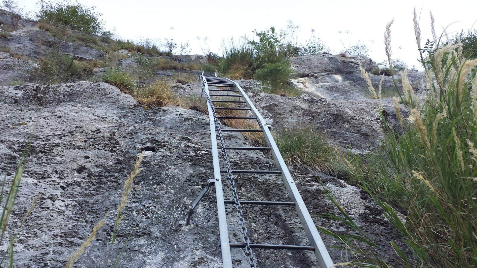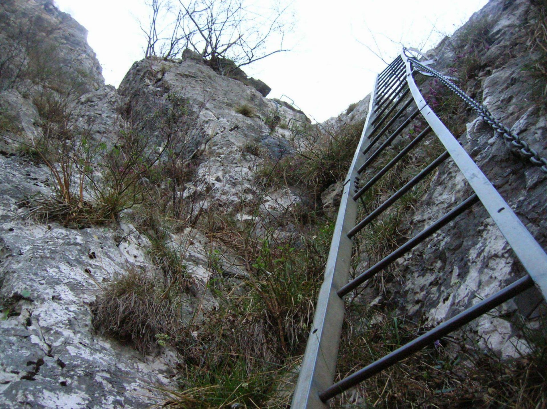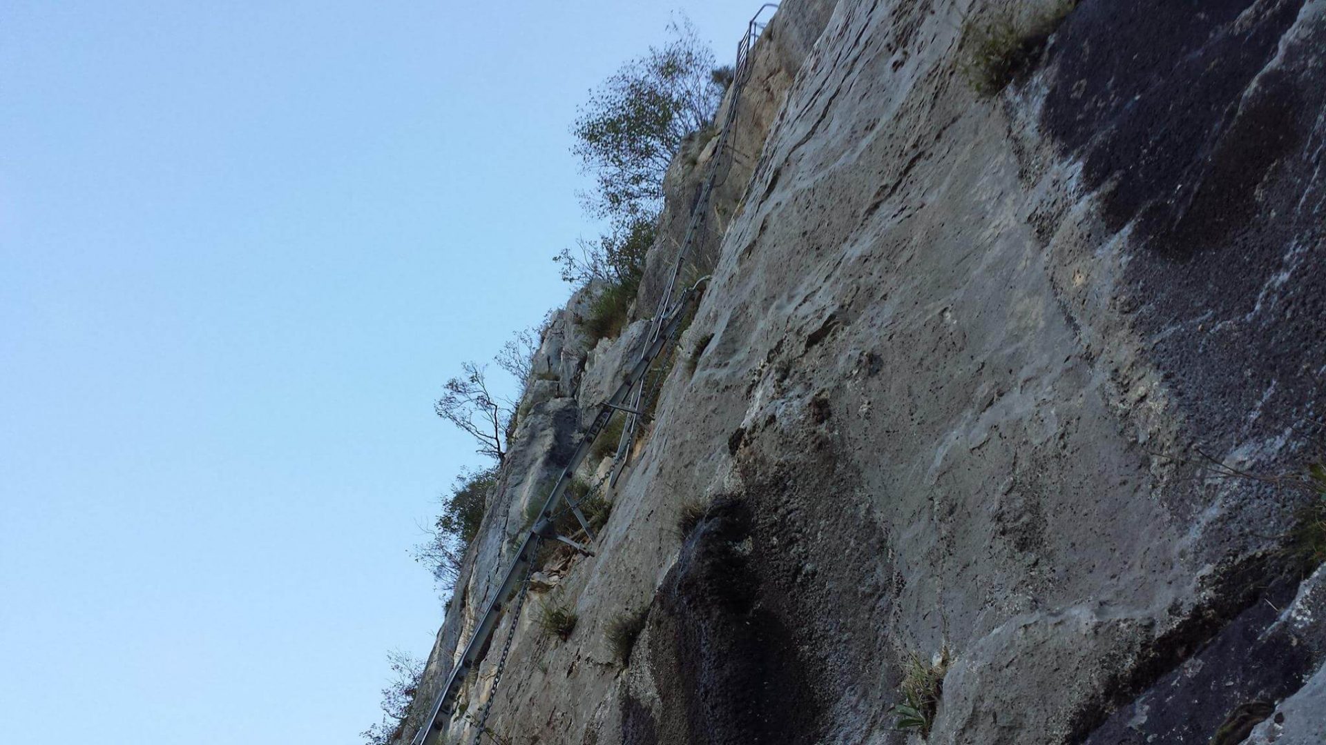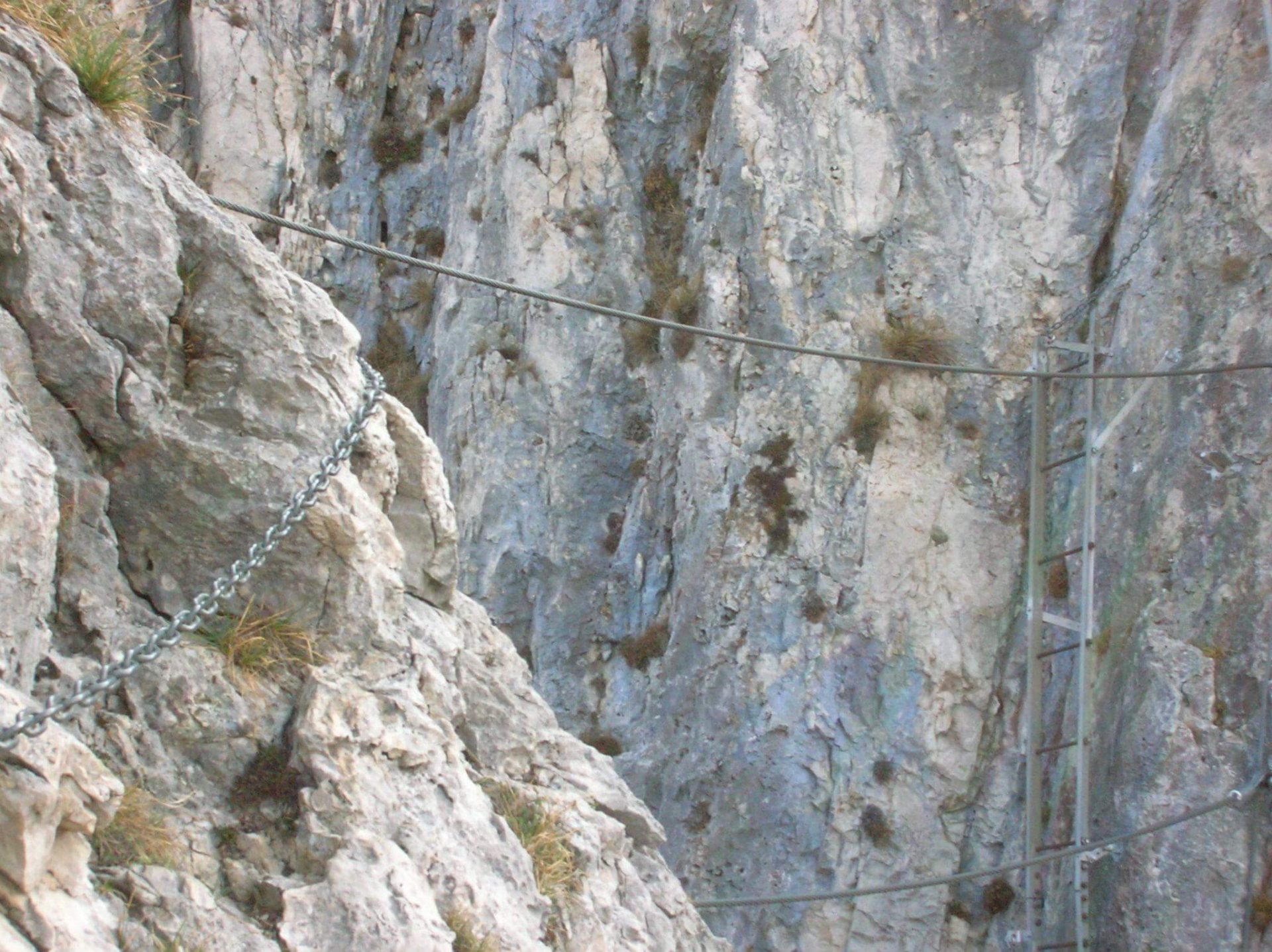 Ferrata molto più addomesticata dopo i lavori del 2022, adesso tutta con cavo d’acciaio, gradini e tutte le lunghe scale storiche per i tratti più verticali.